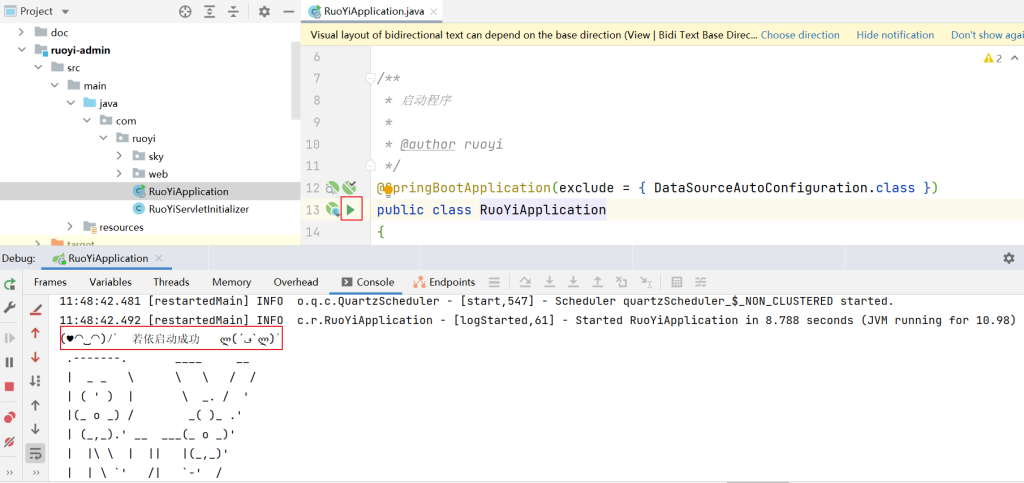 在ruoyi-admin模块下,运行com.ruoyi.RuoYiApplication.java,出现如下图表示启动成功