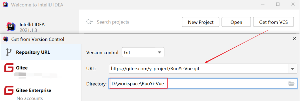 通过idea克隆若依源码,仓库地址:https://gitee.com/y_project/RuoYi-Vue.git