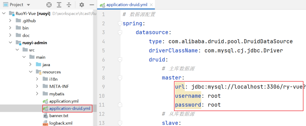 在ruoyi-admin模块下,编辑resources目录下的application-druid.yml,修改数据库连接
