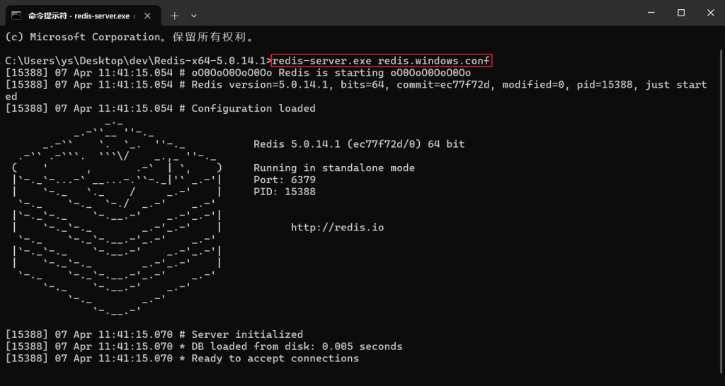 在redis解压目录下,执行redis-server.exe redis.windows.conf启动