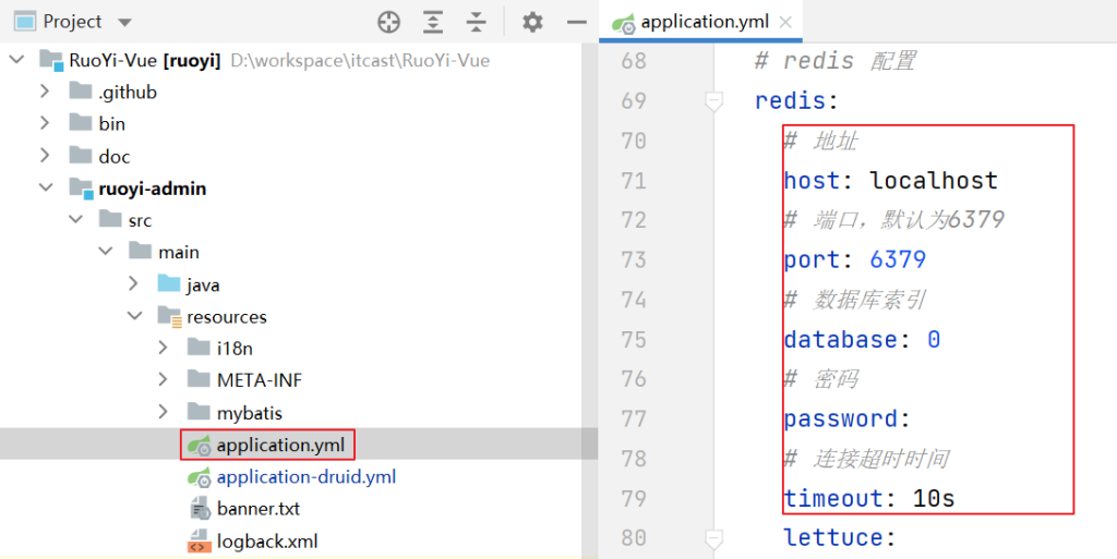 在ruoyi-admin模块下,resources目录下的application.yml,可以设置redis密码等相关信息