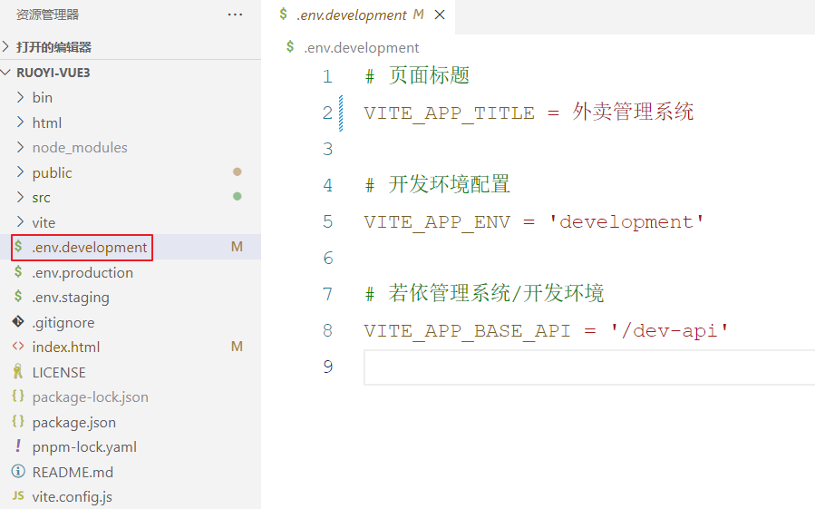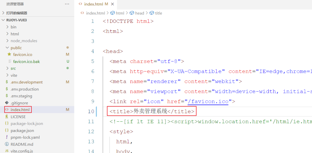 若依的系统页面标题引用的是开发环境的配置,我们只需要修改开发的环境的VITE_APP_TITLE属性即可