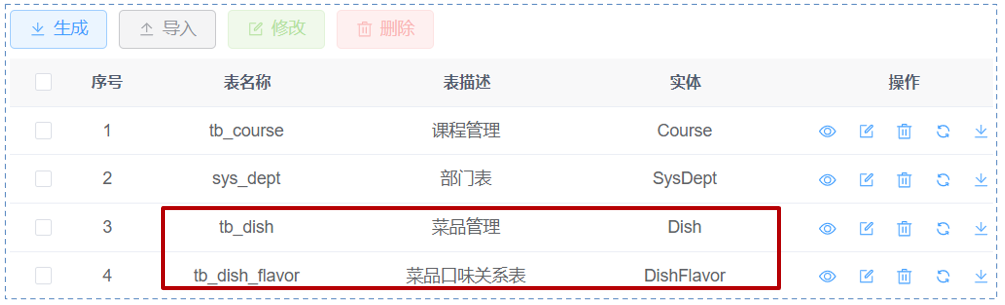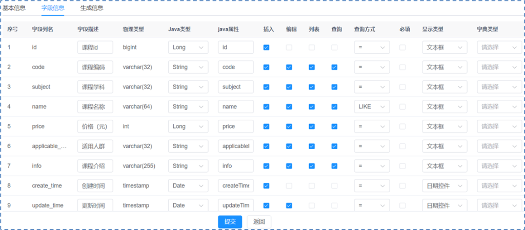 代码生成列表中找到课程表(可预览、编辑、同步、删除生成配置)