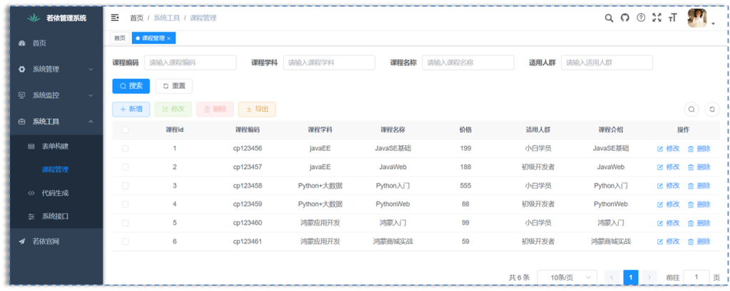 接下来,我们将利用若依框架的代码生成器实现CRM系统中的课程管理功能,这将使我们能够实际体验并掌握如何在项目中有效使用这一工具。