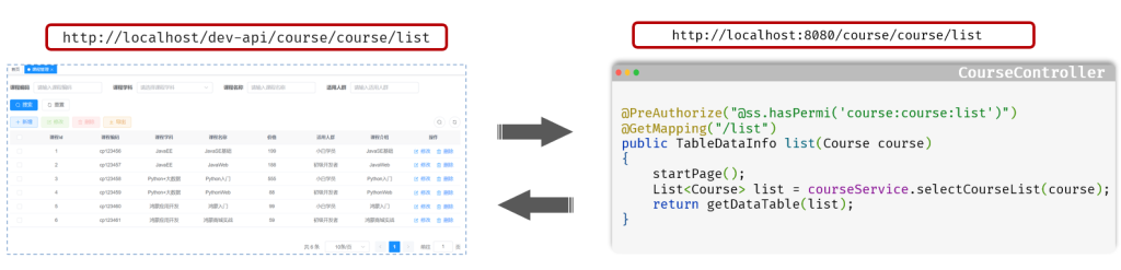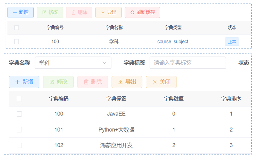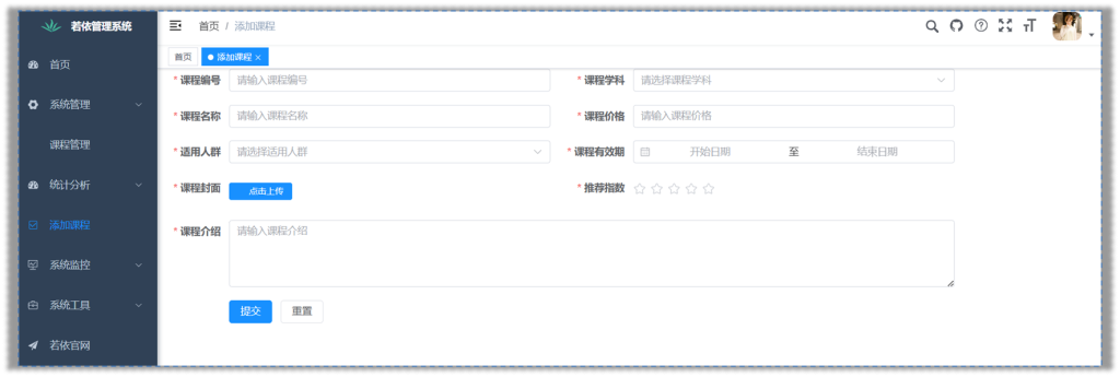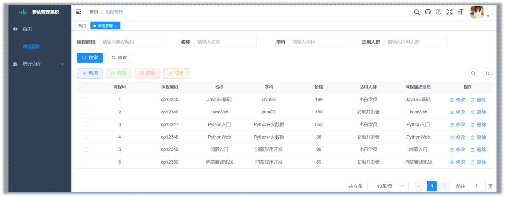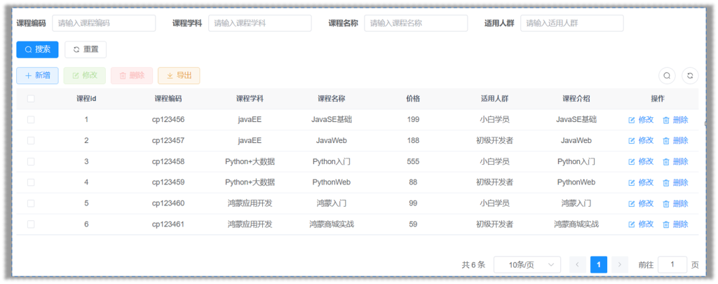 实现CRM系统中的课程管理功能,涵盖增加、删除、修改和查询课程信息的完整前后端代码。
