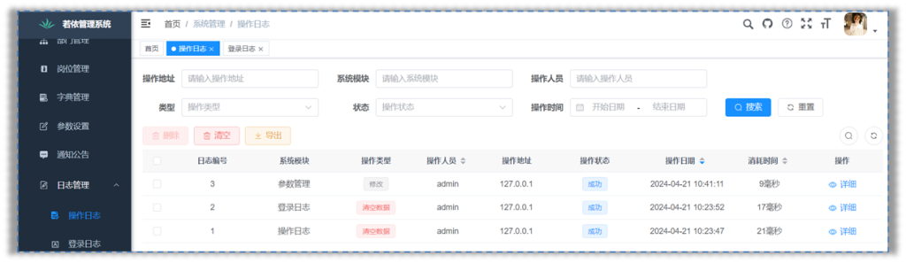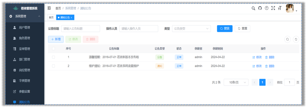 - 前后端分离版本:RuoYi-Vue利用SpringBoot作为后端开发框架,与Vue.js结合,实现了前后端分离的开发模式。这种架构有助于提高开发效率,前后端可以独立开发和部署,更适合现代化的Web应用开发。